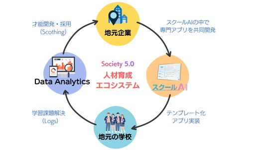 本パッケージでは、教育向け生成AIプラットフォーム「スクールAI」と伴走型支援を組み合わせることで、地域産業と教育を接続し、教育と採用が循環する“地域共創型DX人材育成エコシステム”の構築を目指します。