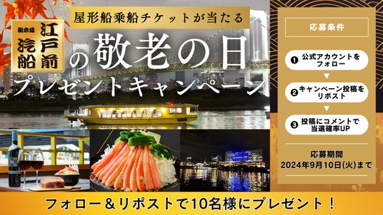 浜友グループの江戸前汽船株式会社(本社:東京都江東区、代表取締役:後藤武彦)は、屋形船に乗船できるペアギフトチケットや最大20%OFFの割引券が当たる、SNSでのプレゼントキャンペーンを9月3日(火)より開始することをお知らせいたします。