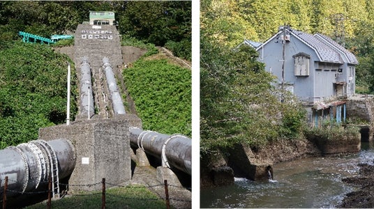 ・末沢発電所では、自然に囲まれた風景とともに発電のために水圧鉄管内を流れるダムの水流を間近に