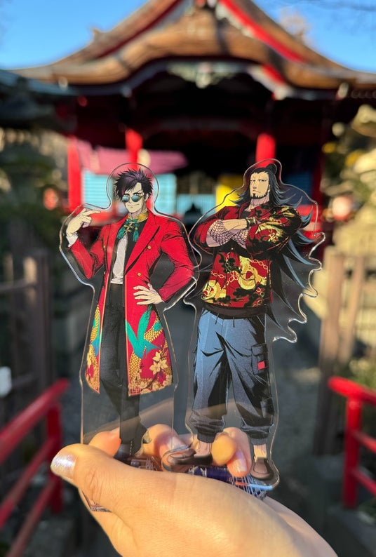 2月1日にコアミックス公式オンラインショップ“ゼノンショップ”で販売を開始した終末のワルキューレ オフショットコレクション「アクリルスタンド 呂布奉先」、終末のワルキューレ オフショットコレクション「アクリルスタンド 始皇帝」がお寺のような場所をバックに2人並んで写真を撮っている。