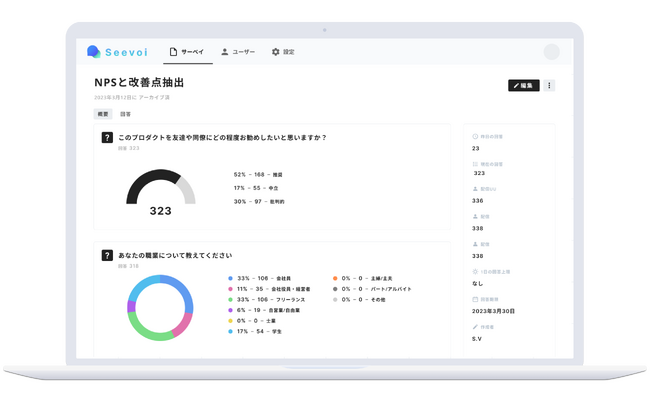 「Seevoi」は、ユーザー理解を高速化・省力化して事業を成長に導くSaaSです。Webサイトやメディア、SaaSなどのITプロダクトに導入することで、ユーザーがITプロダクトやサイトを訪問した際に、その画面上に適切なタイミング・適切な位置にアンケートを表示して、様々なフィードバックや意見を収集することができます。別途アンケートページに遷移するものとは異なり、ユーザーがプロダクトを利用している時に回答を収集できるため、回答の質や回答率の向上が期待できます。
