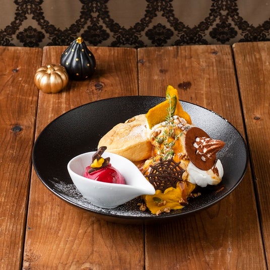 【イシヤパンケーキハロウィン~魔女からのおくりもの~】1,760円(税込)人気のパンケーキに北海道産のかぼちゃカスタードを合わせ、
