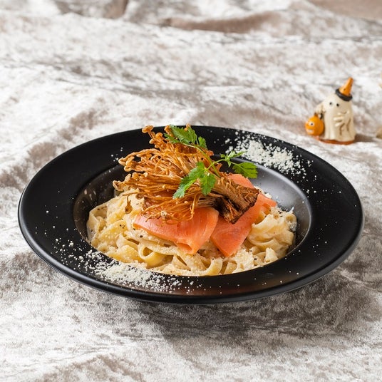 【スモークサーモンとポルチーニクリームのフェットチーネ】1,300円(税込)香りのよいポルチーニクリームソースともちもち食感の平麺「フェットチーネ」がよく絡みます。