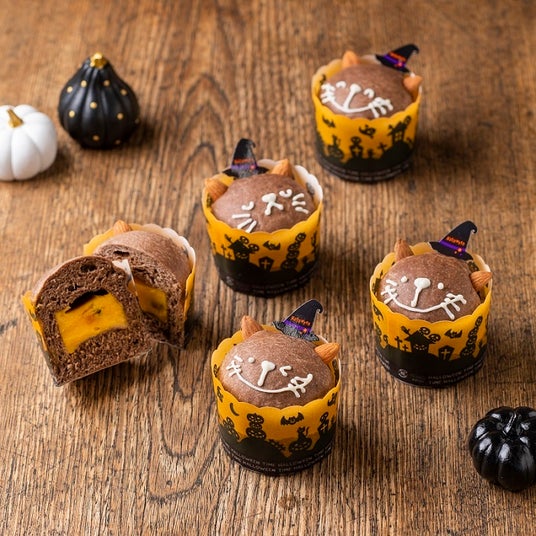 【魔女猫のかぼちゃクリームパン】280円(税込)チョコブリオッシュ生地で北海道産かぼちゃのクリームを包み込み、ハロウィンカップで可愛く焼き上げました。