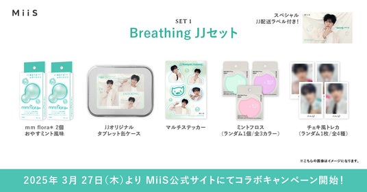 「至近距離OK!ミリ単位で近づくお守りサプリ」というキャッチコピーで人気の「mm flora*(エムエムフローラ)おやすミント風味」と、「ミントフロス」が入ったBreathing JJセットは、いつでもどこでも美しい息を目指せるようにという想いを込めました。
