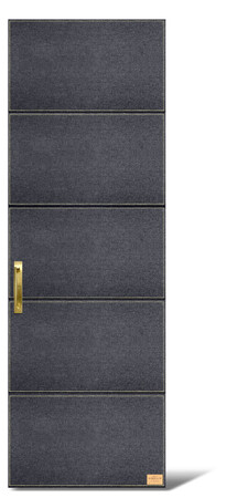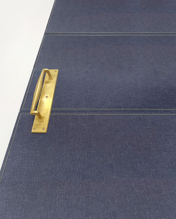 生地は岡山県産のデニムを使用しました。濃紺2種類をチョイスし、ドアの表と裏にそれぞれ配置。表裏で絶妙に異なる雰囲気を楽しんでいただきたいと考えております。生地の角や手を触れる部分などは経年変化し、その家特有の表情になっていきます。