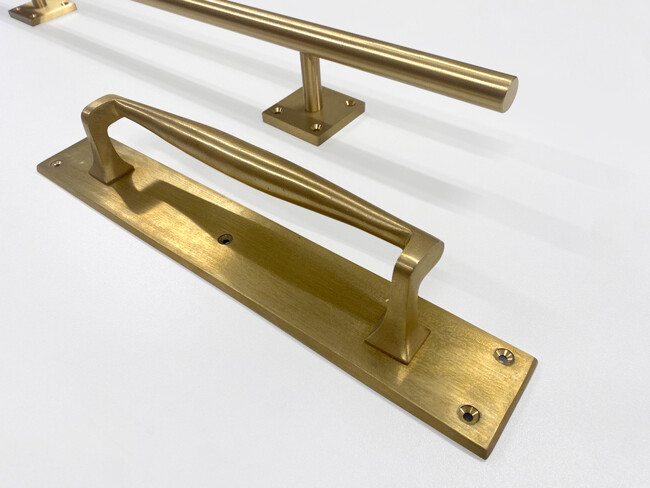ハンドルには真鍮製のものを使って、ヴィンテージ感にこだわりました。60cmのロングバータイプと、20cmのショートハンドルタイプは、どちらも使い込むほどに味の出る真鍮ならではのエイジングを楽しむことができます。くすんだゴールドの色合いがデニム生地と相性抜群です。