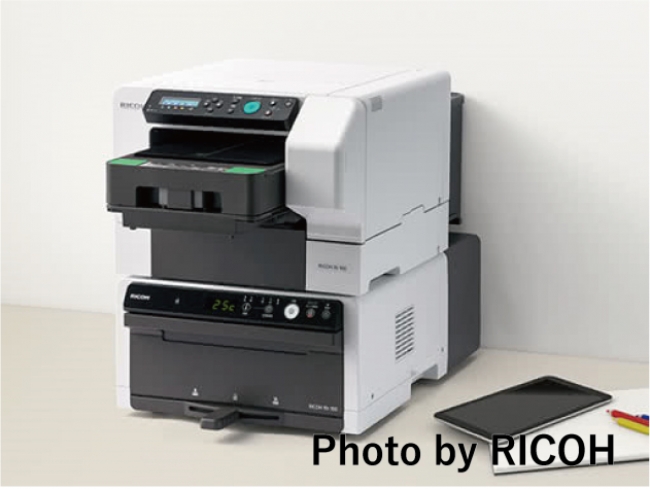 コラボレーションROOTOTEを制作するトートバッグプリンターは、コンパクトで素早くきれいに布にプリントができる「RICOH Ri 100」を使用しています。(一部作品を除く)