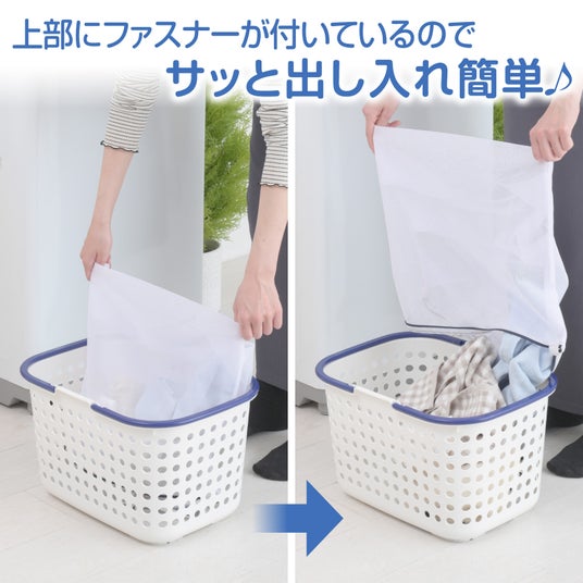 一般的な洗濯ネットではファスナー位置が前面上部のものが多いですが、本品はファスナーをネットの上端に付けているので、洗濯物の出し入れがしやすくなっています。