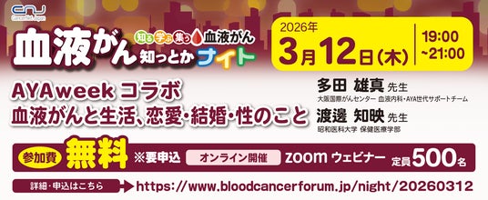 認定 NPO 法人キャンサーネットジャパン(東京都文京区 理事長 岩瀬 哲)は、2023年より毎月1回、血液がんに関するオンラインセミナー「血液がん知っとかナイト」を実施しています。25 回目となる 2026 年 3 月は AYA WEEK 2026 とのコラボ企画として「血液がんと生活、恋愛・結婚・性のこと」をテーマに開催する運びとなりました。