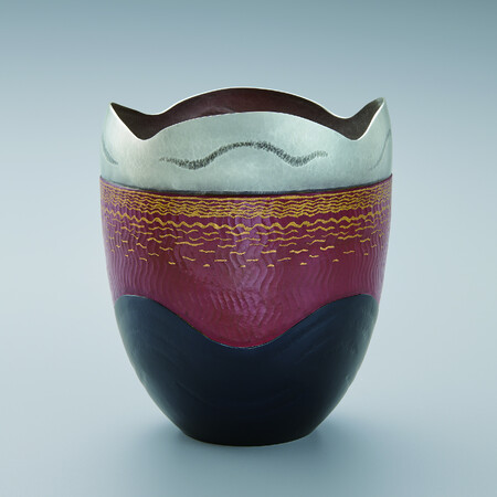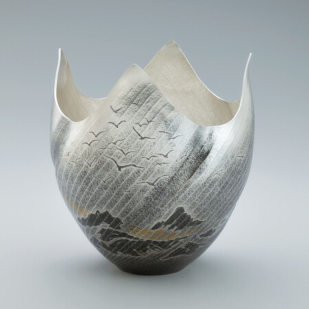 「日本人の心の奥底にある自然の原風景を器に盛る」ことをテーマに制作を続ける大角さん。万物を照らす日月の光、刻々とかたちを変えてゆく波の姿、水面を走る風、移ろいゆく雲といった形態の定まらない自然の姿を、金や銀、銅などの金属を素材とし、鍛金、彫金、象嵌の高度な技を駆使して「うつわ」に表現していきます。