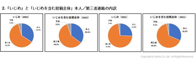2. 投稿者の内訳(「いじめ」と「いじめを含む投稿全体」における本人 / 第三者連絡の内訳)