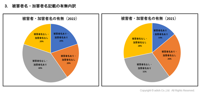 「被害者名あり・加害者名あり」は20%と、6%(前年度14%)増加し、「被害者名あり・加害者名なし」は20%と6%(前年度26%)減少しました。