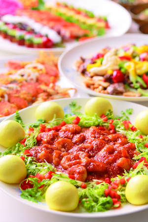 ●海老のチリソース煮 ●牛肉のブラックペッパー風味 ●白身魚の甘酢餡かけ ●海老のマヨネーズ ジン風味
