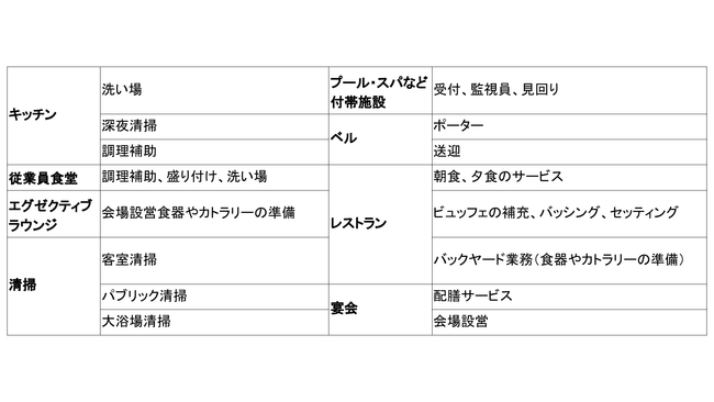 ホテル業界で、スキマバイト人材の労働力の最大化を可能にしているのが、「業務の細かい切り分け」です。キッチンから清掃、レストランまで幅広い部門で活用されていて、各部門の中でも、初めて勤務する人が安心して働ける仕事や何回か勤務した人(リピートワーカー)と相性の良い仕事など、業務が細かく切り分けられています。
