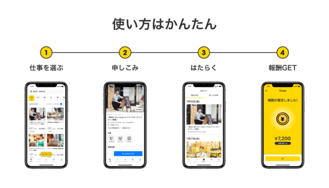 タイミーは「働きたい時間」と「働いてほしい時間」をマッチングするスキマバイトサービスです。働き手は、働きたい案件を選ぶだけで、応募・面接が無しですぐに働くことができ、勤務終了後すぐにお金を受け取ることができます。 事業者は、来て欲しい時間や求めるスキルを設定するだけで、条件にあった働き手が自動的にマッチングします。