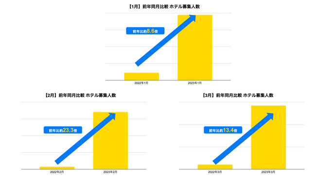 タイミー上のスキマバイト(ホテル業界での業務)の直近3ヶ月の募集人数の前年同月比を見てみると、2023年1月は約8.6倍、2023年2月は約23.3倍、3月は約13.4倍となっていることがわかりました。前年に比べてここまで増加したのは、昨年10月以降のインバウンド需要の回復の影響が大きいと推察されます。