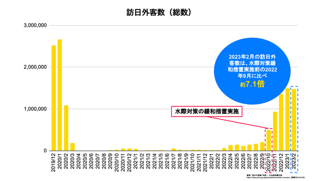 2022年10月、海外からの個人旅行の受け入れや入国ビザ免除の再開などの政府による水際対策の緩和措置実施以降、入国者数は増加し続けています。2023年2月の訪日外客数は、前年同月比で約88.2倍。緩和措置実施前の2022年9月に比べて約7.1倍の伸び率となりました。