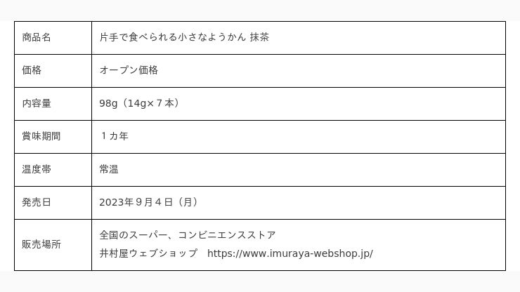 井村屋株式会社(本社:三重県津市高茶屋七丁目1番1号、社長:岩本 康)は、「片手で食べられる小さなようかん」シリーズの新商品として、『片手で食べられる小さなようかん 抹茶』を9月4日(月)より全国で順次発売します。