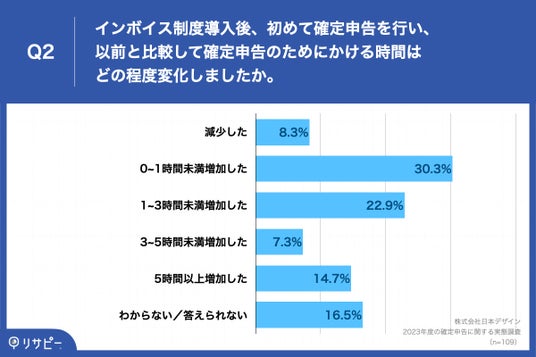「Q2.インボイス制度導入後、初めて確定申告を行い、以前と比較して確定申告のためにかける時間はどの程度変化しましたか。」(n=109)と質問したところ、「0~1時間未満増加した」が30.3%、「1~3時間未満増加した」が22.9%という回答となりました。