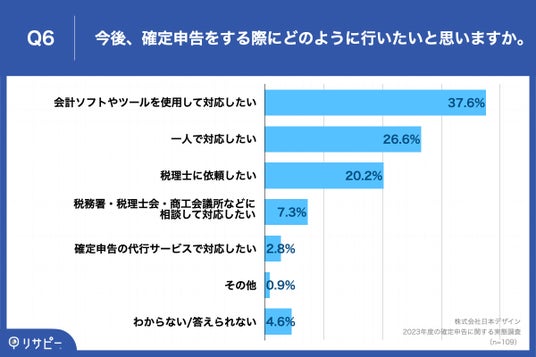「Q6.今後、確定申告をする際にどのように行いたいと思いますか。」(n=109)と質問したところ、「会計ソフトやツールを使用して対応したい」が37.6%、「一人で対応したい」が26.6%、「税理士に依頼したい」が20.2%という回答となりました。