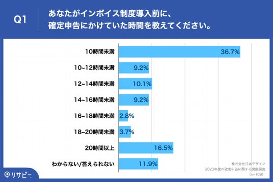 「Q1.あなたがインボイス制度導入前に、確定申告にかけていた時間を教えてください。」(n=109)と質問したところ、「10時間未満」が36.7%、「20時間以上」が16.5%、という回答となりました。