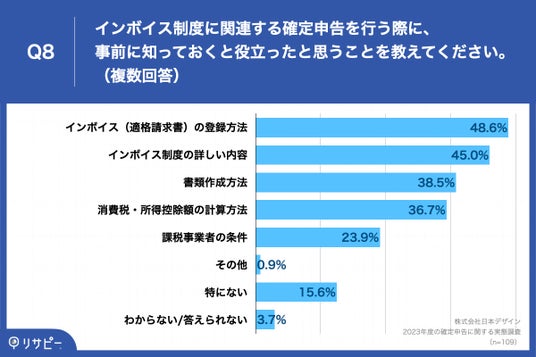「Q8.インボイス制度に関連する確定申告を行う際に、事前に知っておくと役立ったと思うことを教えてください。(複数回答)」(n=109)と質問したところ、「インボイス(適格請求書)の登録方法」が48.6%、「インボイス制度の詳しい内容」が45.0%、「書類作成方法」が38.5%という回答となりました。