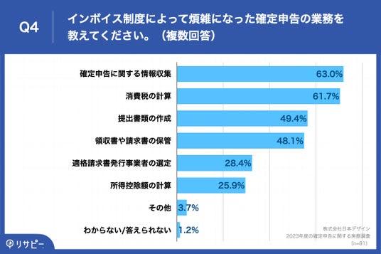 Q3で「非常に感じた」「やや感じた」と回答した方に、「Q4.インボイス制度によって煩雑になった確定申告の業務を教えてください。(複数回答)」(n=81)と質問したところ、「確定申告に関する情報収集」が63.0%、「消費税の計算」が61.7%、「提出書類の作成」が49.4%という回答となりました。