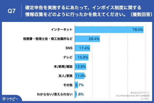 「Q7.確定申告を実施するにあたって、インボイス制度に関する情報収集をどのように行ったかを教えてください。(複数回答)」(n=109)と質問したところ、「インターネット」が78.0%、「税務署・税理士会・商工会議所など」が28.4%、「SNS」が17.4%という回答となりました。