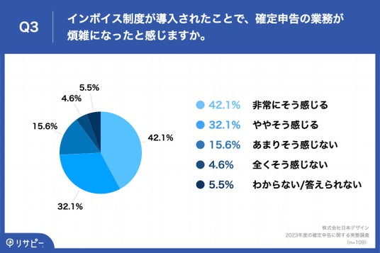 「Q3.インボイス制度が導入されたことで、確定申告の業務が煩雑になったと感じますか。」(n=109)と質問したところ、「非常にそう感じる」が42.1%、「ややそう感じる」が32.1%という回答となりました。