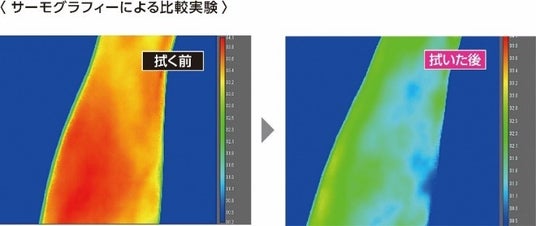 前腕内側部を3往復ふいた直後とふく前で皮膚表温度を比較(当社調べ)