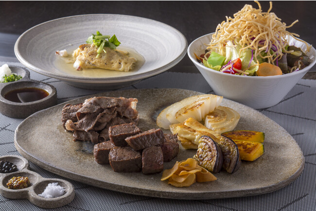 明石産の蛸と焼き穴子を玉子生地で包み焼きした“明石焼き”風の前菜、パリパリに揚げた味付きビーフンをトッピングした旬野菜のサラダなど、兵庫ゆかりのアレンジの利いた品々が集うランチコース。メインは、繁殖から肥育まで一貫して手掛ける「盛本牧場」の神戸ビーフのステーキとソテーが登場。最高品質の馥郁たる香りと旨みをじっくりとご堪能ください。