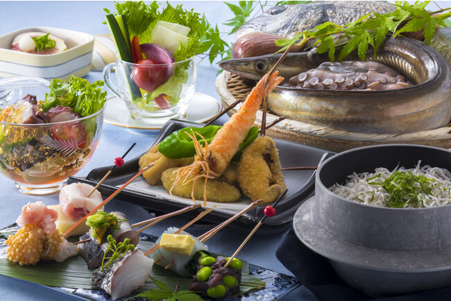 串あげは、神戸ポーク柔煮、梅肉でいただく兵庫県産鱧のおかき揚げ、淡路・ぬしま鯵の味噌掛け、朝倉山椒が香る須磨の黒鯛などの山海の幸に加え、丹波黒と餡子の創作串など全12 種が登場。他に、明石蛸の前菜、淡路産ちりめんをたっぷりのせた新温泉町こしひかりの釜飯など兵庫の味覚満載でお届けします。