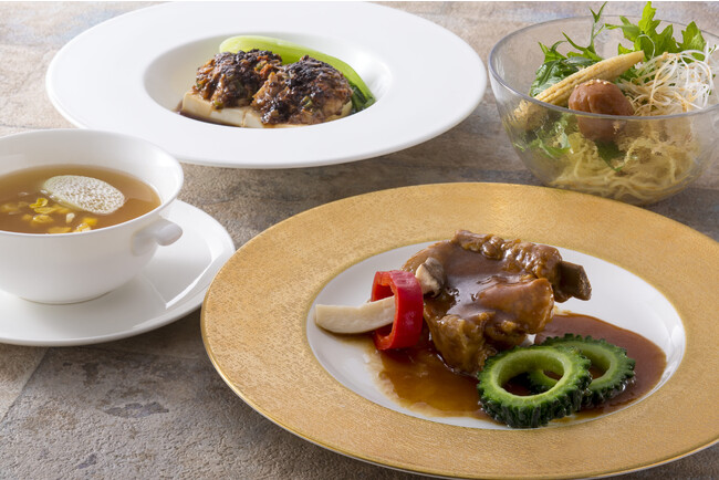 トウモロコシの中でも特に甘いゴールドラッシュは、実も軸もコトコト煮込んで滋味深い澄んだスープに。スズキは地豆腐を合わせて香味溢れる豆鼓蒸しに、骨付き三田ポークは苦瓜とともにこっくりした中国風の味噌煮にするなど、兵庫県の旬食材を駆使した味わい豊かなコース。締めは、南高梅の酸味をアクセントにしたさっぱりとした冷やし中華そばをどうぞ。