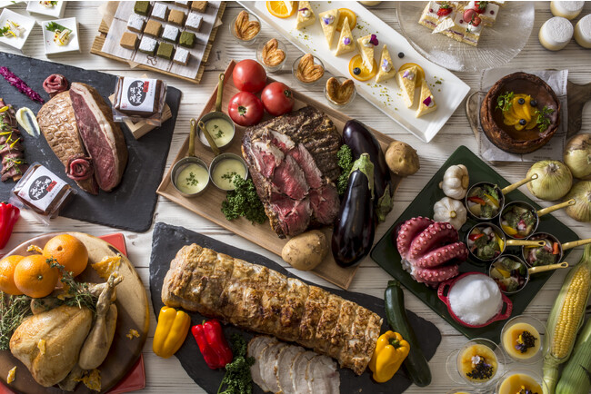神戸ポークや淡路どりなどの肉料理や瀬戸内産の魚介料理のほかに、甘いスイートコーンはウニと合わせてババロワに、香りの良い養父ニンニクはソースに、丹波の黒大豆味噌は冷製ローストビーフの香り付けに…と、随所に県産食材の個性が光る品々が登場。ハートパイや濃厚チーズケーキなど「洋菓子の街神戸」を象徴する多彩なスイーツもお見逃しなく!