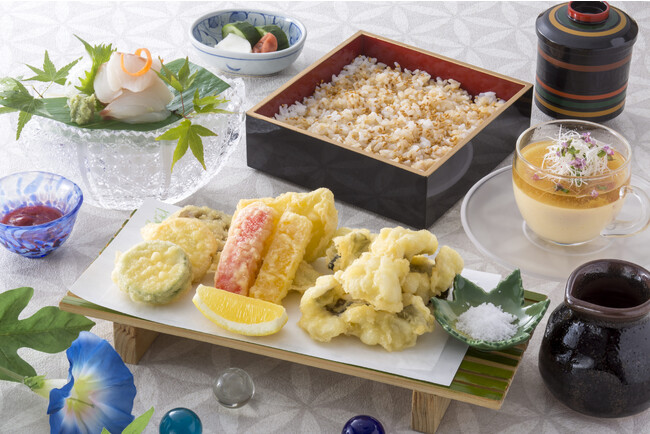 天ぷらは、淡路産の肉厚な鱧に加えて、甘くて瑞々しい淡路産玉葱、食感の良い姫路蓮根、磯の香り高い兵庫海苔などボリューム満点。ゴマとたれを混ぜた重箱入りの丹波産こしひかりとお好きに合わせてお召し上がりください。そのほか、梅肉醤油でいただく淡路産スズキの洗い、兵庫県産トマトの冷やし茶碗蒸しなどさっぱり涼味仕立ての品々もお愉しみに。