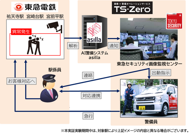 株式会社アジラ(本社:東京都町田市、代表取締役:木村大介、以下「アジラ」)、東急セキュリティ株式会社(本社:東京都世田谷区、代表取締役社長:下形和永、以下「東急セキュリティ」)は、東急電鉄株式会社(以下「東急電鉄」)の協力のもと、東急電鉄の駅構内において、東急セキュリティが提供する画像×警備オペレーションサービス「TS-Zero(ティーエスゼロ)」(以下、「TS-Zero」)のサービスラインナップであるAI警備システム「asilla(アジラ) 」(以下、「asilla」)を活用し、駅係員・警備員が連携した警備オペレーションについての実証実験(以下、「本実証実験」)を2023年7月11日(火)より開始します。