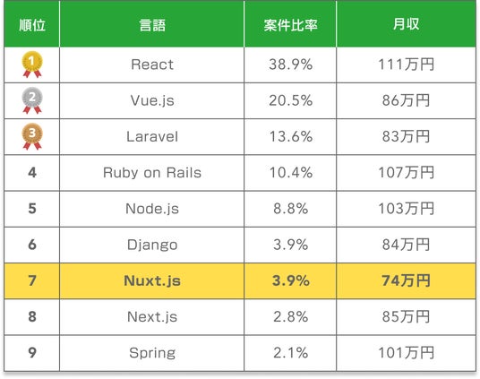 Nuxt.jsの案件数は全体の3.9%を占めており、案件数ランキングでは7位という結果になっています。ニッチながらも確実な需要が見込める技術領域といえるでしょう。