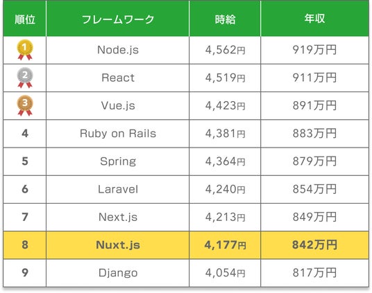 Nuxt.jsの案件では、平均年収が842万円となっており、フレームワーク年収ランキングでは8位という結果になっています。企業からの需要も高く、特にSSR(サーバーサイドレンダリング)やSPA開発において重要な技術として位置づけられています。
