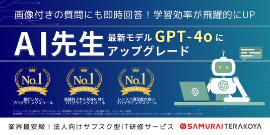 株式会社SAMURAIが運営する、プログラミング学習者の疑問を解決するQ&A掲示板『AI先生』は、使用するAI技術を「GPT-4 Turbo」から最新モデルである「GPT-4o」にアップグレードしたことをお知らせいたします。