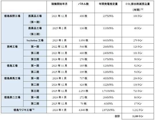 *11 大塚ホールディングスが設置・管理する太陽光発電設備のうち、徳島ワジキ工場利用分の情報を記載
