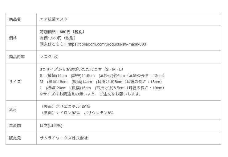 サムライワークス株式会社(代表取締役社長:新島 実 本社所在地:東京都渋谷区)は、この秋冬の感染防止に向け、高い通気性と吸水速乾、持続抗菌を追求した『エア抗菌マスク』を2万枚完売につき、本日より緊急追加生産分を特別価格1枚680円(税抜)にて販売を開始致します。