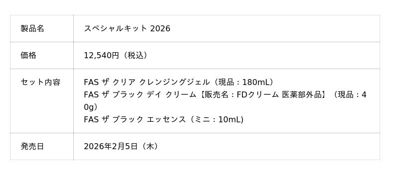 「京都産発酵はちみつエキス*³」を配合し、乾燥する季節でもつるりと潤う「FAS ザ クリア クレンジングジェル」と、SPF50+ / PA++++のハイスペックなUVカット機能を搭載しつつ、高いスキンケア効果も備えたUV兼デイクリーム「FAS ザ ブラック デイ クリーム(販売名:FDクリーム 医薬部外品)」、さらに、FASの定番アイテムの「FAS ザ ブラック エッセンス」がミニサイズでセットになったスペシャルなキットです。