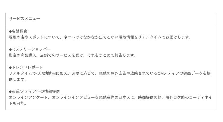 旅行ではなく、現地に在住している日本人が調査員なので、日本人の感覚を持ちながら、現地のリアルを正確にお伝えすることが可能です。