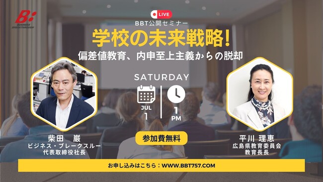 生涯学習を推進し、あらゆる年齢層に教育を提供する株式会社ビジネス・ブレークスルー(所在地:東京都千代田区、代表取締役:柴田巌、以下BBT)は、「学校の未来戦略」をテーマにした無料公開セミナーシリーズの第5回を開催いたします。