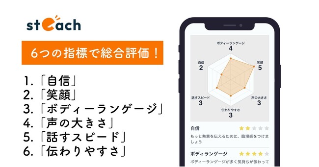 『steach』は、これまで3万6,000名以上(※1)の就職支援を行ってきた当社の求職者のニーズをもとに開発したもので、「ひとりで気軽に面接練習ができて、客観的な評価がもらえる」面接練習アプリです。当社の面接対策ノウハウとAIを活用することで、ユーザーが回答した音声と動画を6つの指標で定量的に評価します。
