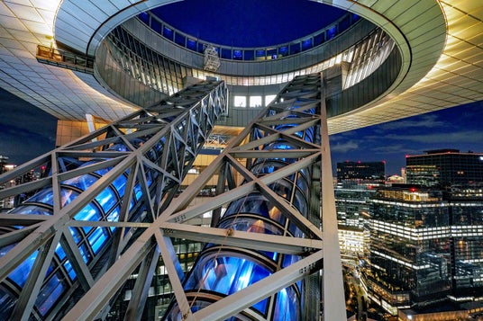 梅田スカイビルは、2つのビルが屋上を含む上層部「空中庭園」でつながる独特のフォルムの連結超高層ビル