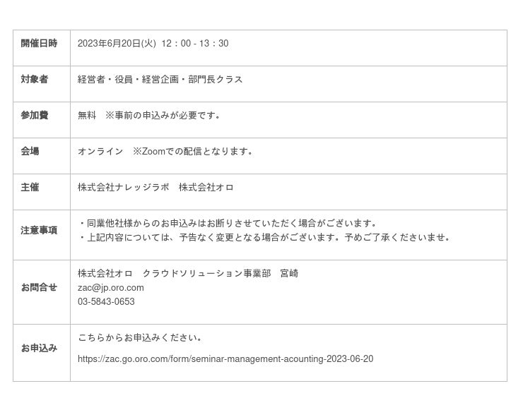 参加希望の方は、お申込みページ(https://zac.go.oro.com/form/seminar-management-acounting-2023-06-20)からお申込みください。たくさんの方々のご参加をお待ちしております。