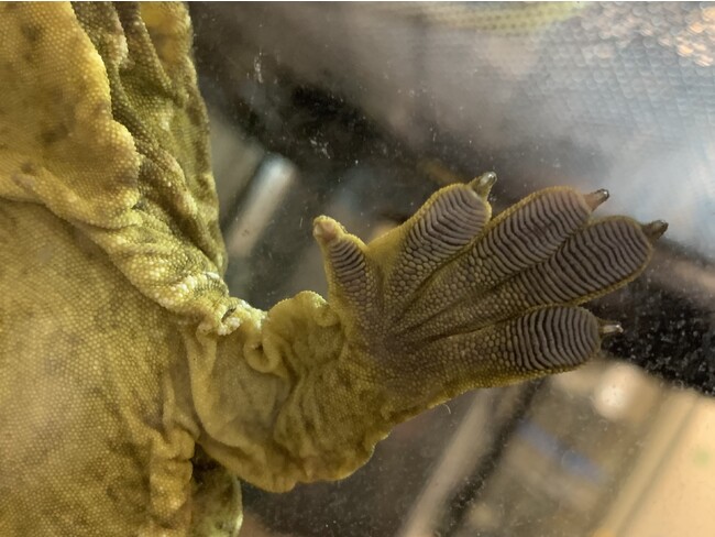 体表は、木のような模様をしており、周りの環境に合わせて体色の濃淡が変化します。指先には趾下薄板(しかはくばん)という特殊な器官があり、分子間力の一種を使ってガラスなどの壁面に張り付くことができます。