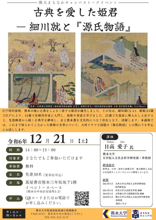 江戸時代後期、熊本の地に古典をこよなく愛する姫君が誕生しました。その名は、細川就(なる)。就姫は4歳で江戸に上り、14歳で有栖川宮家に入門し、和歌や書道を学びました。21歳で久我家に輿入れし上京すると、先祖幽斎から続く古典学を継承し、京と熊本藩を文化的につなぐ存在となり、活躍します。本講演では、これまで知られてこなかった就姫の文事について、大河ドラマで話題の『源氏物語』との関わりを中心にお話しします。また、当日会場では熊大オリジナルグッズの販売会を行う予定です。